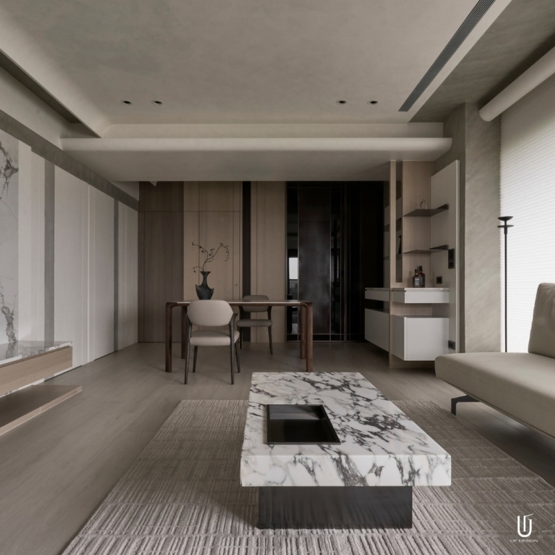 透過仿石材薄板磚的應用,將輕奢感帶入生活場景,展現精緻而內斂的居家質感。從展櫃牆面、中島桌面到玄關地坪,每一處材質搭配都精心考量,呈現出層次豐富且和諧的空間美學。